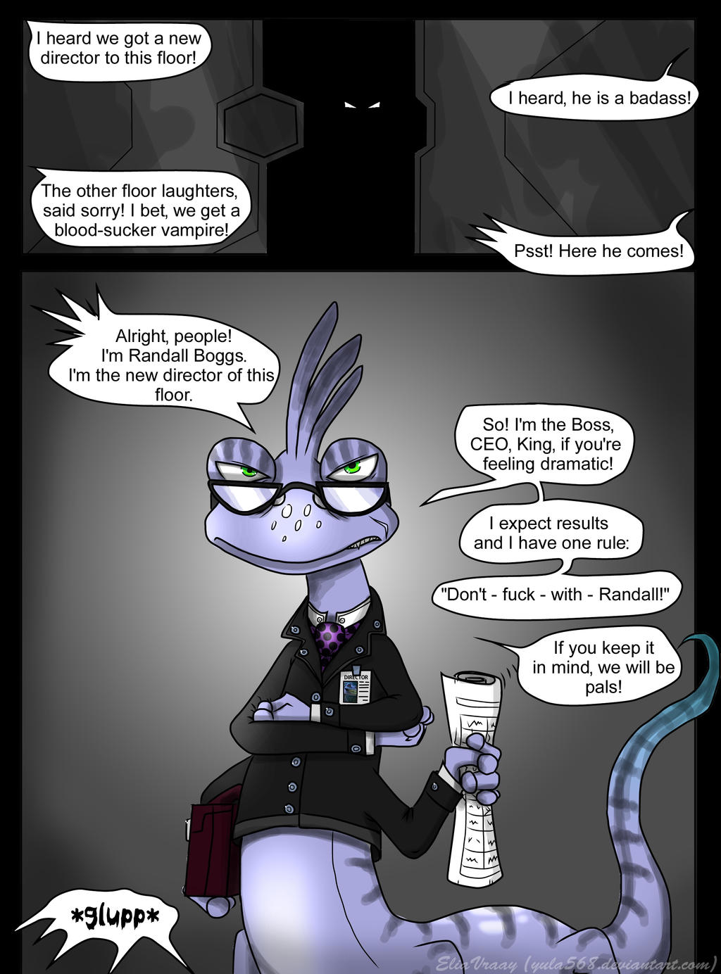 Roz ignored his request, being more concerned that he failed yet again to turn in his paperwork. She then proceeded to slam the shutter shut on Mike's hands, crushing them and making him scream in pain.At the end of the film, it turns out that Roz is Agent #000001 of the, who had been working undercover in the factory for two and a half years to investigate the abuse of the closet doors. She remarked that all her hard work was nearly wasted when and Mike came into possession of, but acknowledges that without their aid, she would not have discovered and 's plot. She gives them both five minutes to say goodbye to Boo as they return her to her, then observes as the door is shredded. Afterward, Roz says she doesn't want to see any paperwork about Boo's invasion, contrary to her requests earlier in the film, which ironically started this whole caper.She is not seen again for the rest of the film, but frequently appears in the film '.' One example is when she unexpectedly pops out of the toilet and startles Sulley, who has opened the bathroom door to get Boo. Another is when the CDA agents surprisingly find her taking place of after he gets his fur shaved off and is showered. The third is when Sulley tries to show Boo that the closet is empty, only to find it occupied by Roz saying 'Guess who!'